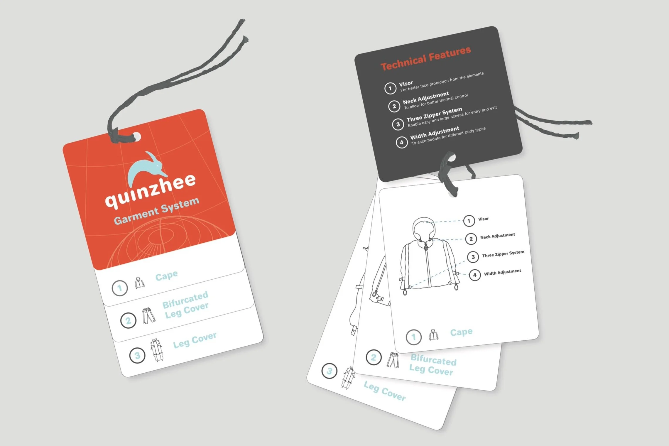 The Quinzhee garment is highly engineered and adaptable, much like the Arctic Hare and quinzhee, which is the inspiration behind the logo. The logo is a rendition of an Arctic Hare in motion symbolizing the adaptability and added mobility afforded by the garment and the quinzhee is represented in negative space to convey the garment's engineered structure. The brand identity is applied across various garments and hang tags and other promotional materials.